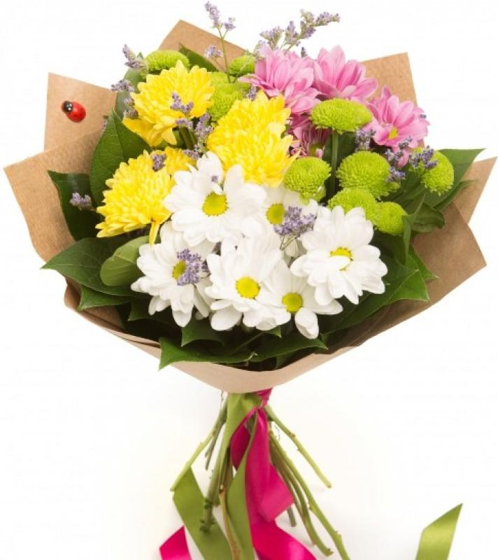 Трогательный букет из чудесных белых, розовых, желтых и зеленых хризантем с зеленью словно ласковое летнее утро, заглянувшее в открытое окно вашей спальни, наполнит вас солнечным настроением, радостью и ожиданием чего-то прекрасного, которое обязательно скоро войдет в вашу жизнь.
